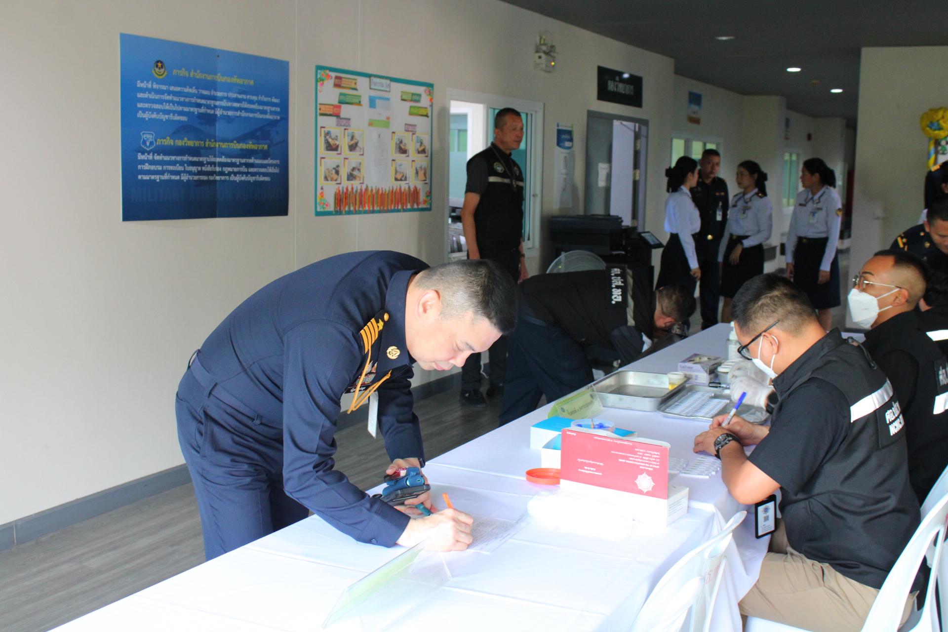 และเข้ารับการตรวจหาสารเสพติดกับเจ้าหน้าที่ของคณะทำงานด้านการป้องกันและปราบปรามยาเสพติดกองทัพอากาศ (สน.ผบ.ดม.)